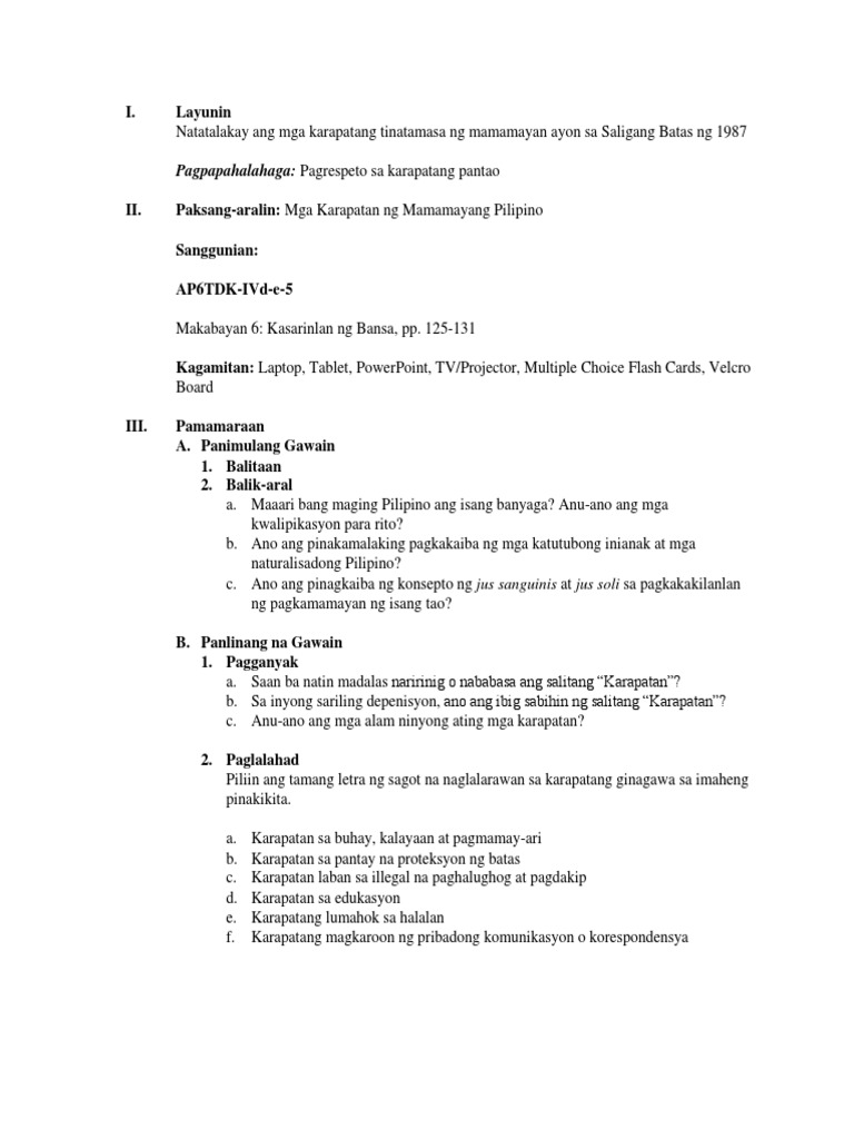 Lesson Plan On Araling Panlipunan 6 Karapatang Pantao Pdf